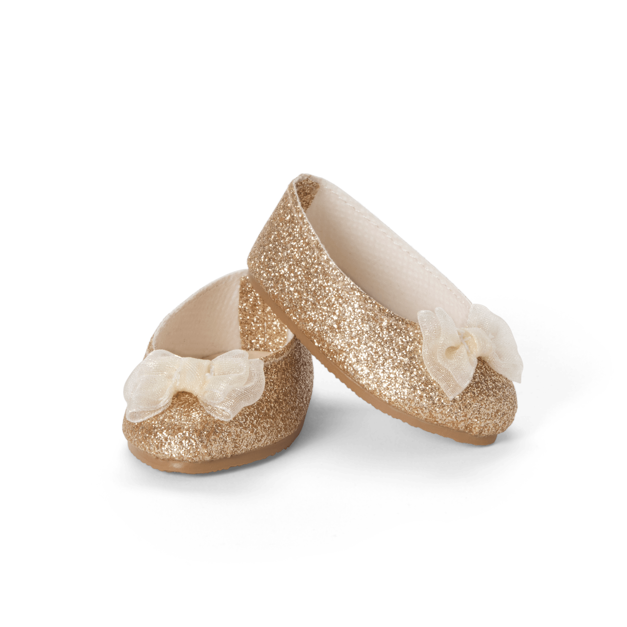 American Girl x Janie and Jack Glitter & Bows Shoes for 18-inch Dolls: A pair of gold-glitter ballet-flat shoes with pointed toes and cream organza bows