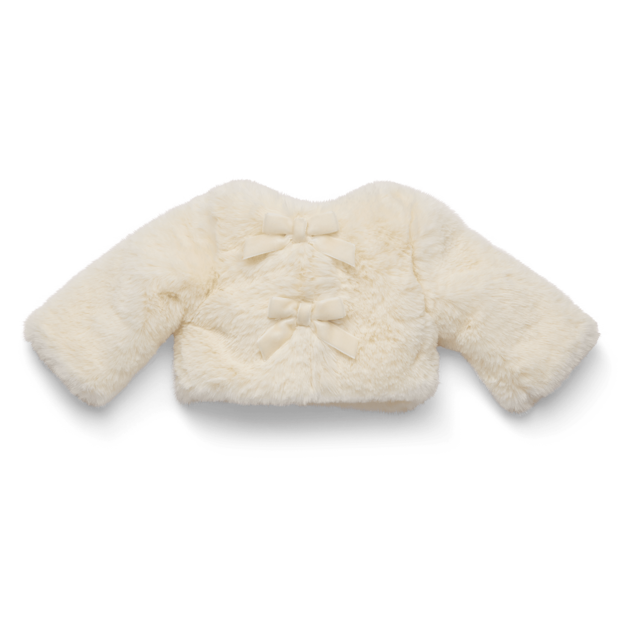 American Girl x Janie and Jack Tied with Bows Jacket for 18-inch Dolls: A cream-colored faux-fur jacket with two velvet bows at the front, plus an American Girl x Janie and Jack hanger