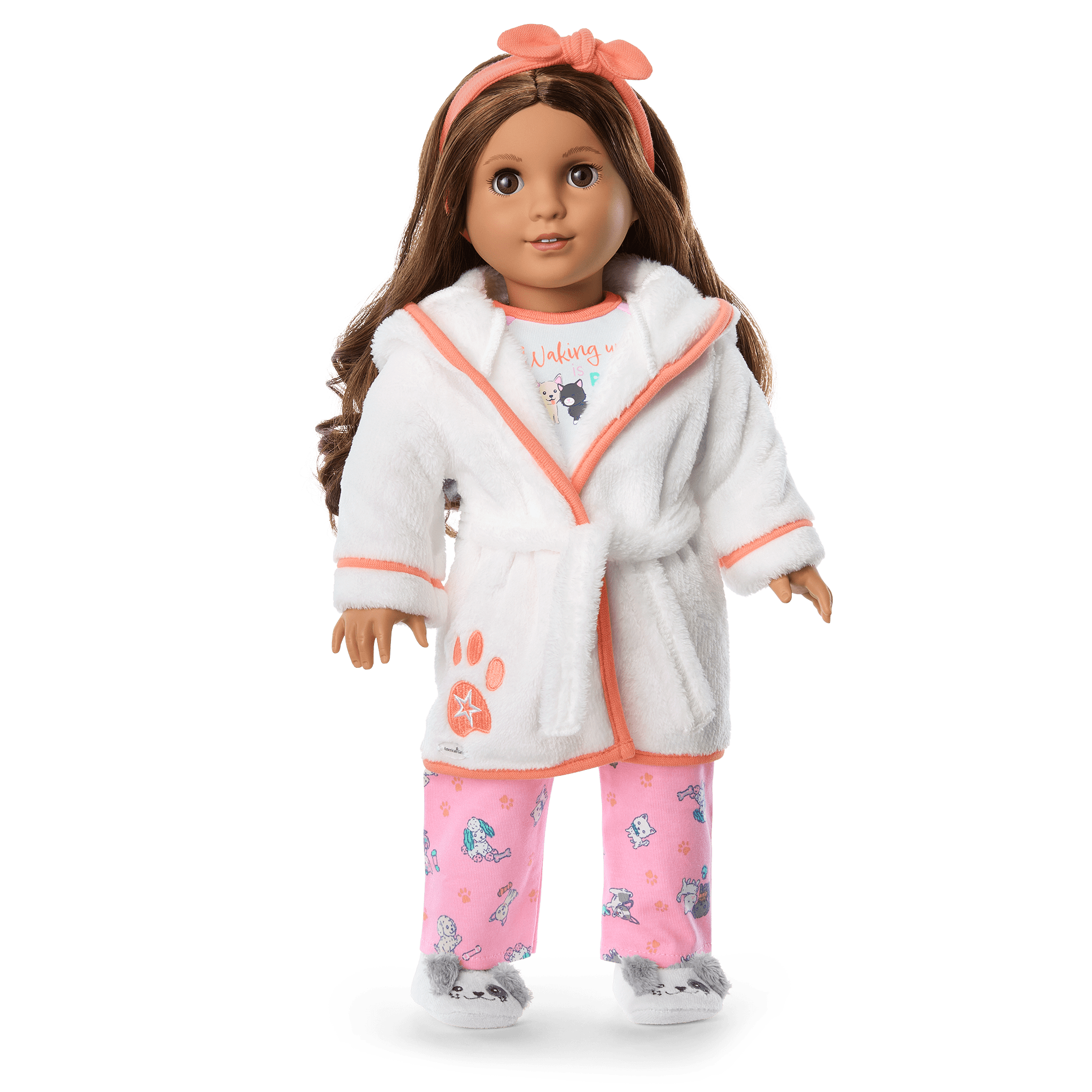 A matching white plush hooded robe for dolls with an embroidered puppy face, plush ears, a bow, and embroidered paw prints at the hem