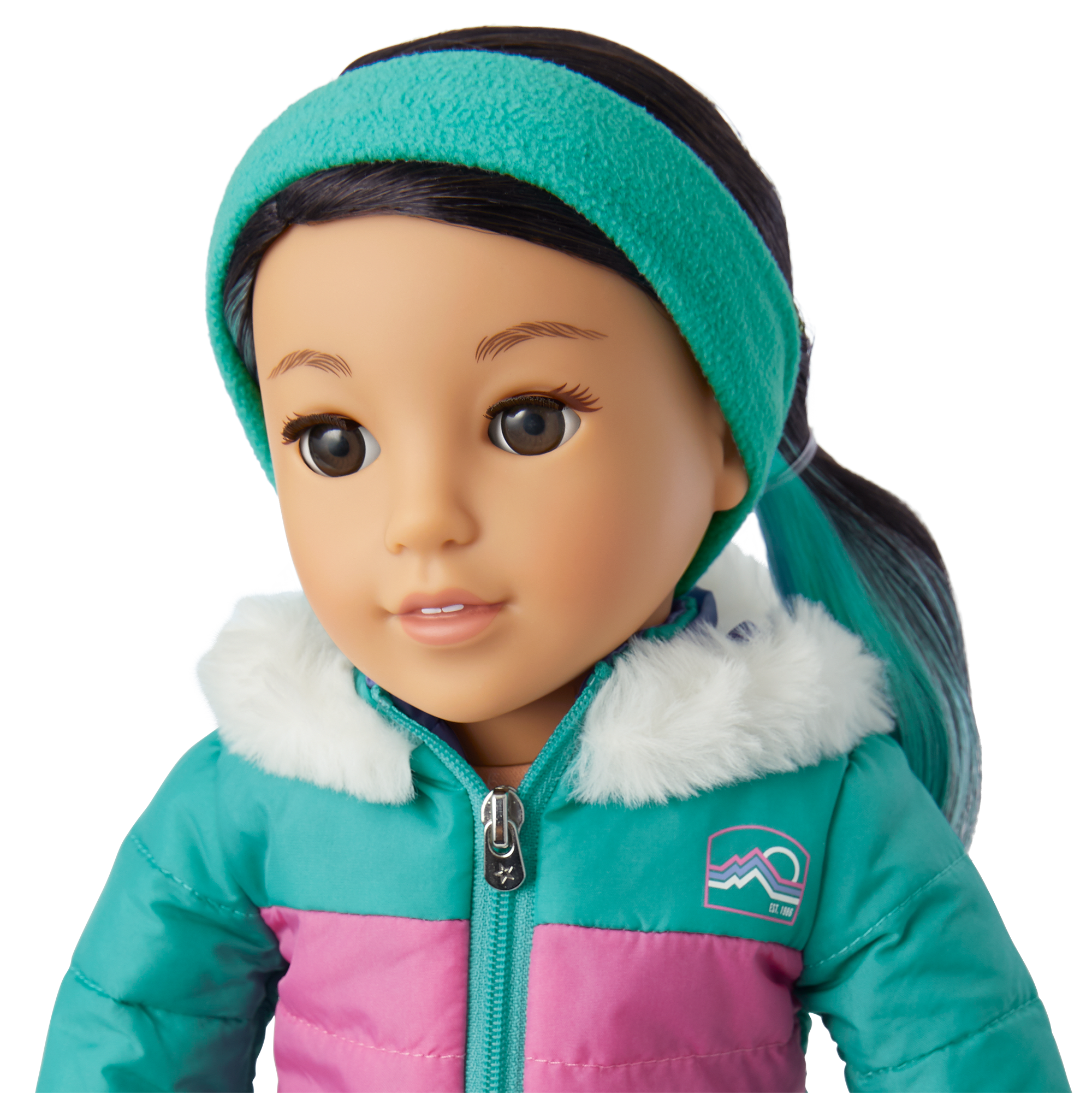 A pink-and-aqua colorblock puffy jacket with a zip front and white faux-fur on the hood