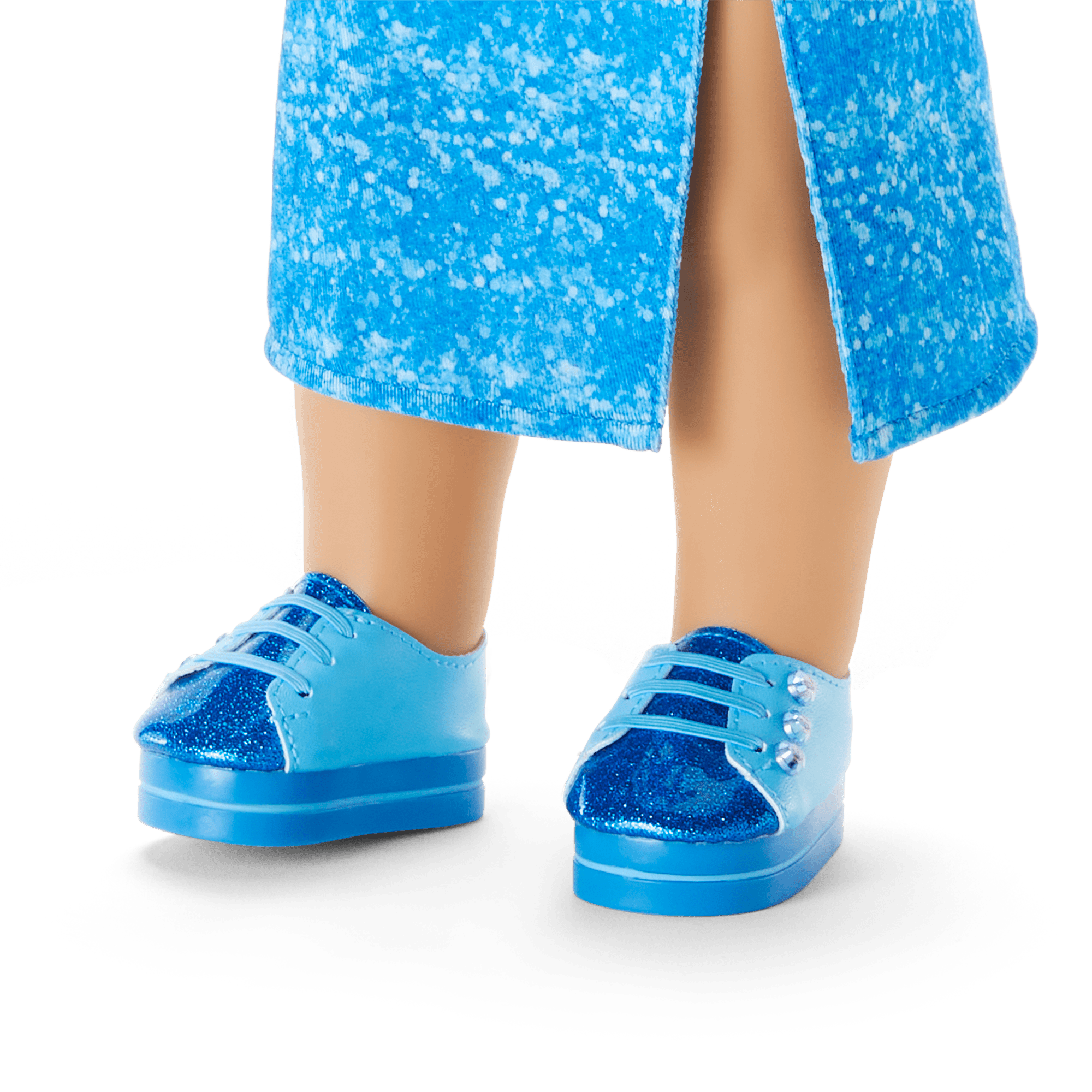A pair of barrettes with three gems on each and a pair of blue platform low-top sneakers with gems, striped soles, and glittery toes