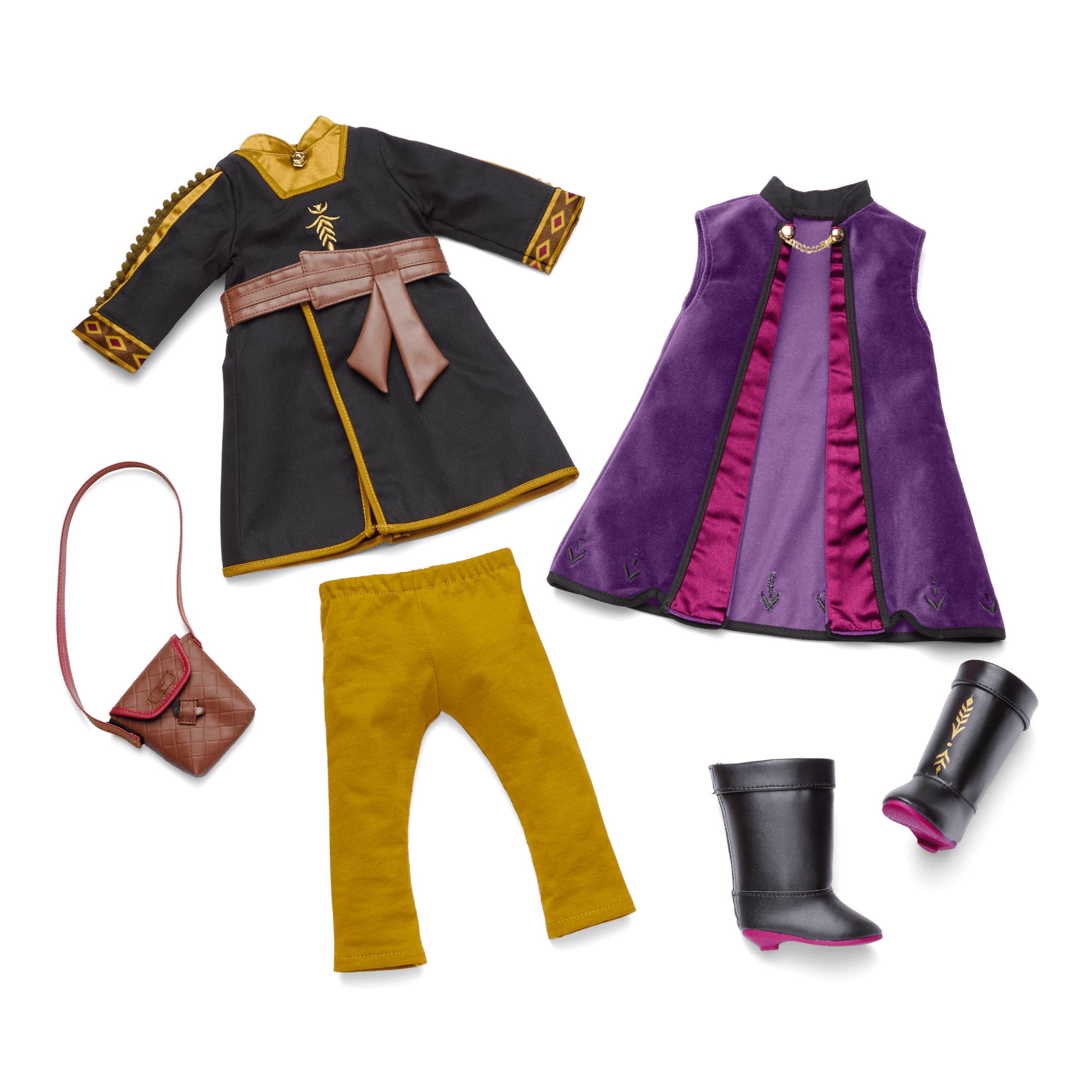 Disney’s Anna is brave and optimistic, which helps her when she is far from home. Play out her adventures with this 5-piece Disney Frozen 18-inch doll outfit and accessory set by American Girl.
