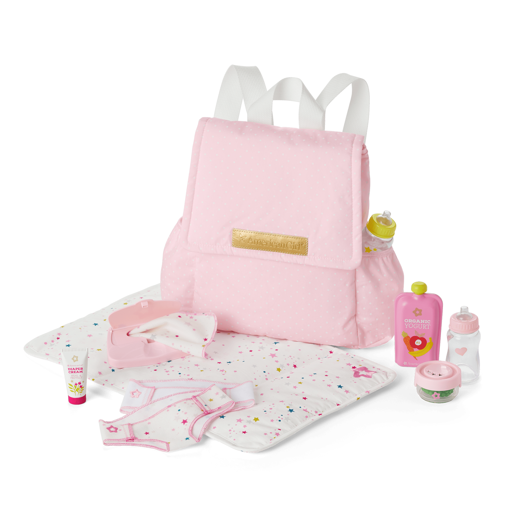 On-the-Go Diaper Bag for Girls: A fabric backpack diaper bag, plus a changing pad, two cloth diapers, two bottles, pretend ointment, a wipe case, and faux food