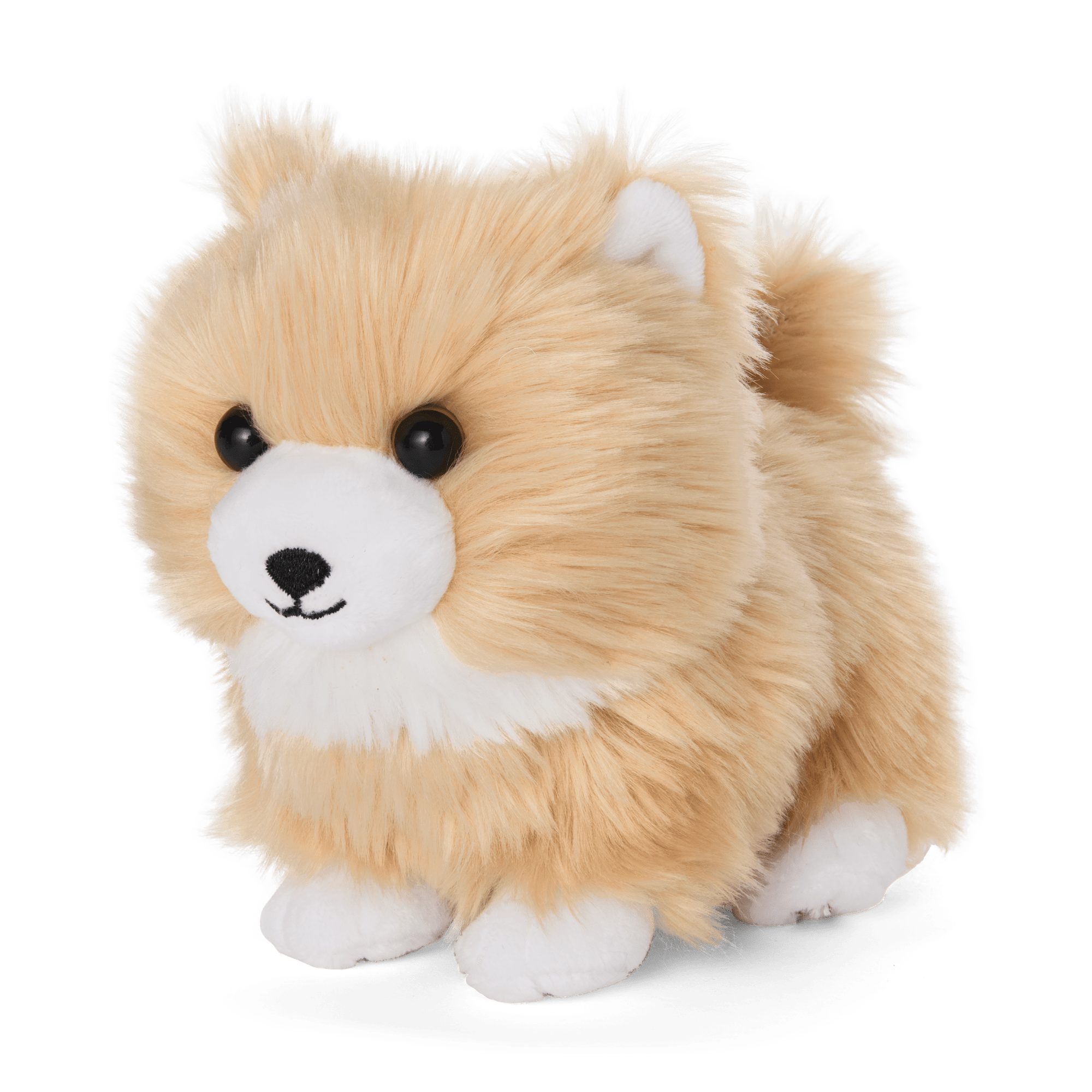 Raquel’s Dog, Luzita: A plush Pomeranian dog with fluffy light-brown fur and a white chest, a tote-bag dog carrier with Luzita’s name embroidered, a poop bag holder, and a water bowl