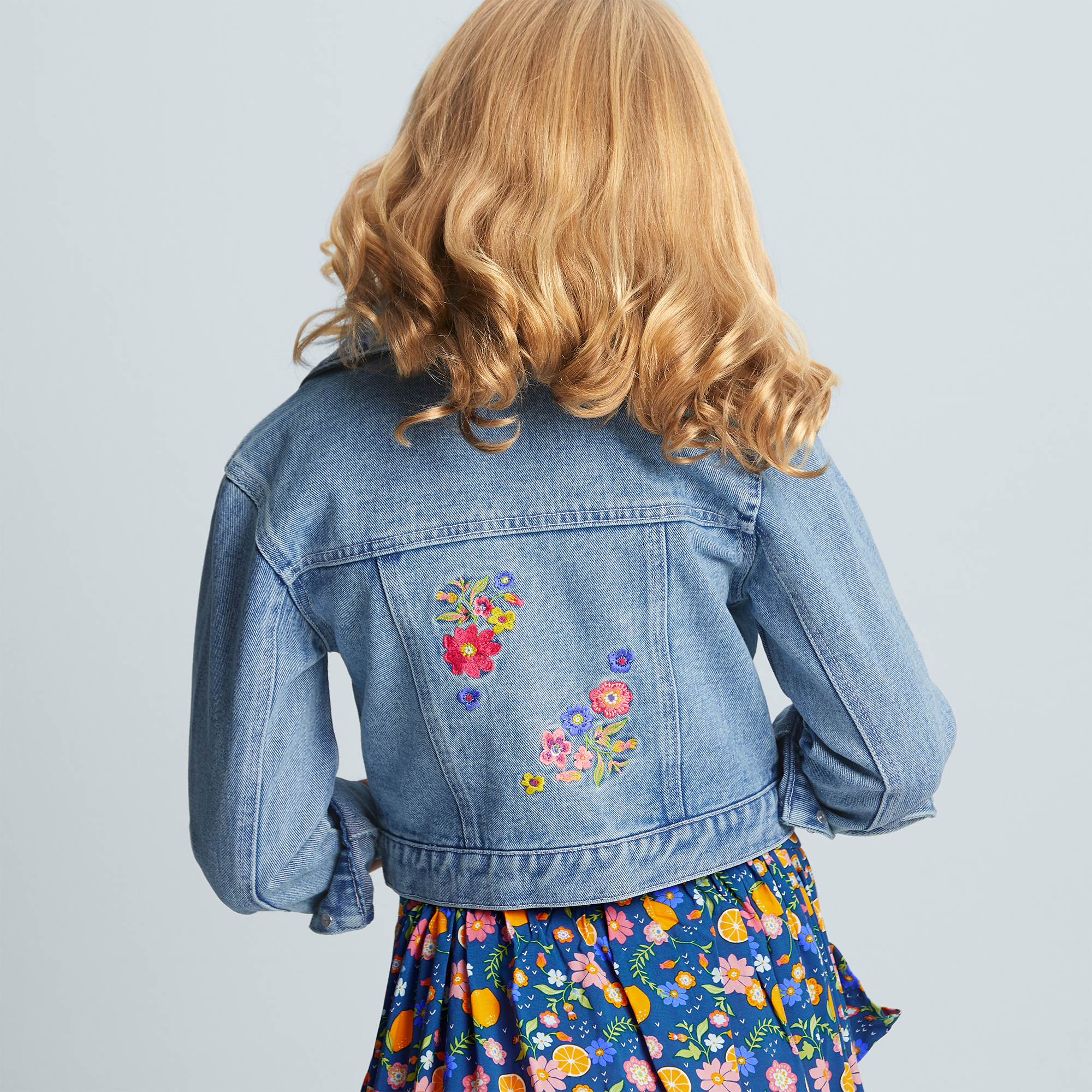 This cute cropped denim jacket features colorful embroidered flowers on the chest and back.