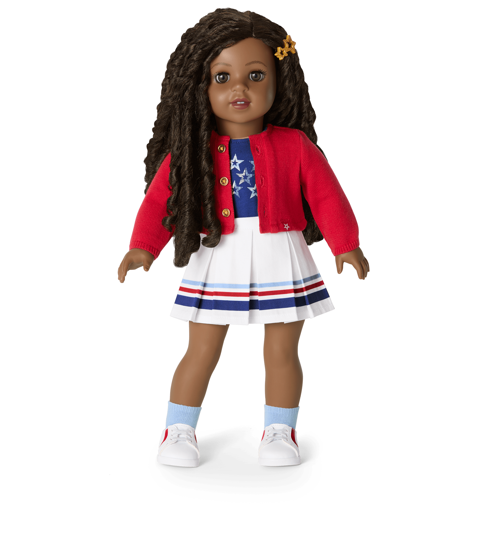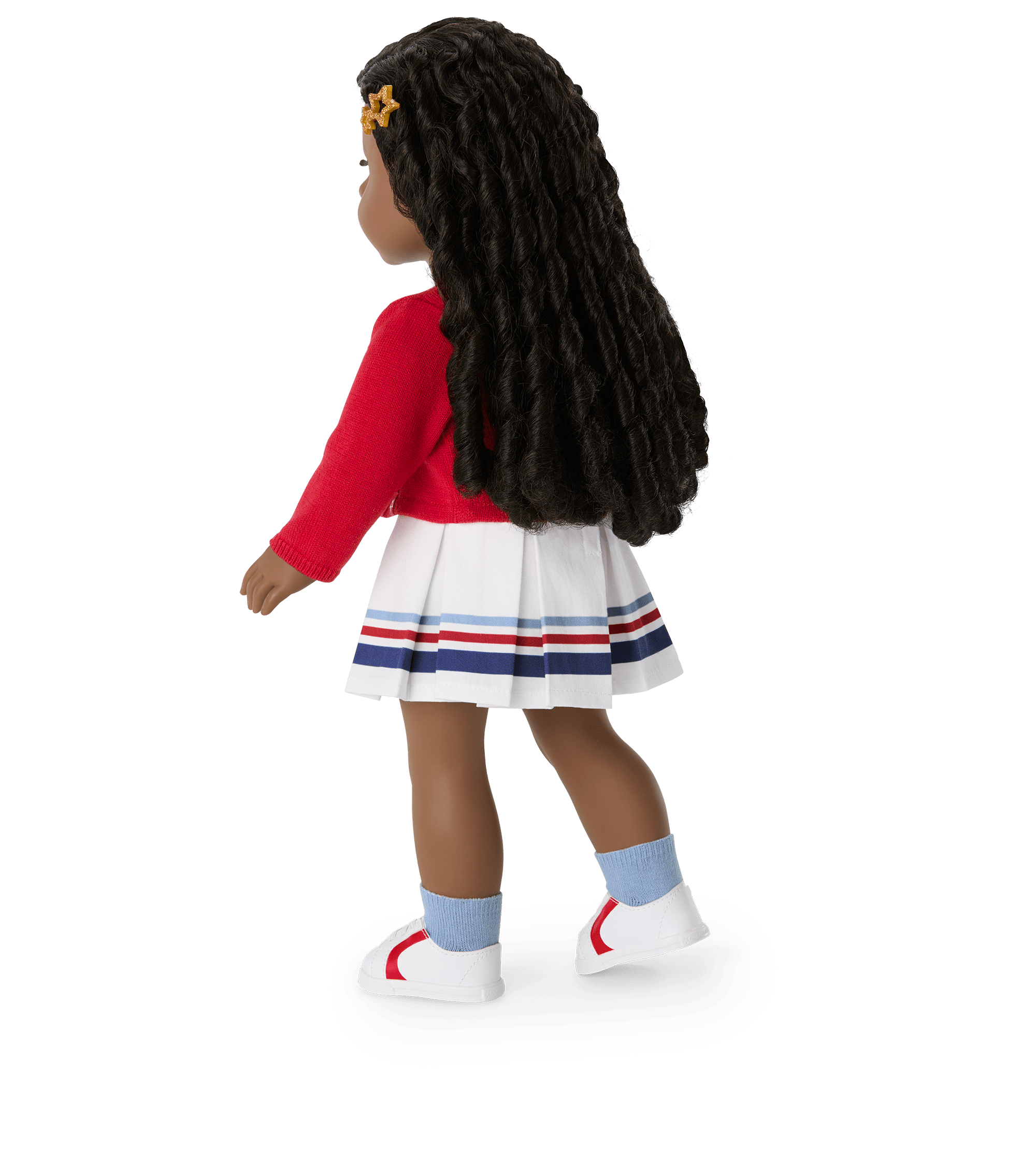 A glittery golden star hair clip, a pair of blue ankle socks, and a pair of low-top white sneakers with red accents at the sides