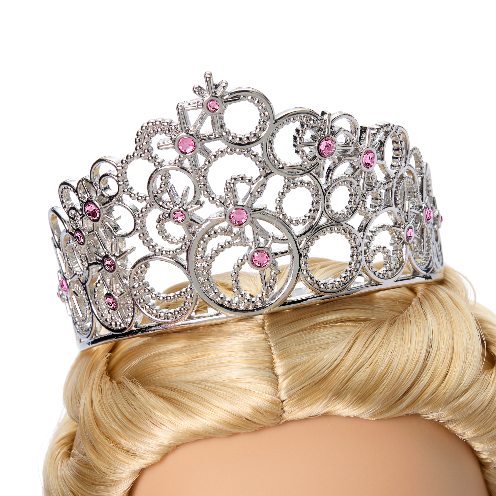 An 18″ doll with brown eyes that open and close smoothly. Her long wavy blonde hair is styled half-up with two twists beneath a tiara. She dazzles with details designed to match the Glinda character, including custom purple eyeshadow, custom eyebrows and lip color, pink bubble-shaped rhinestone earrings in her pierced ears, and pink polish on her fingernails.