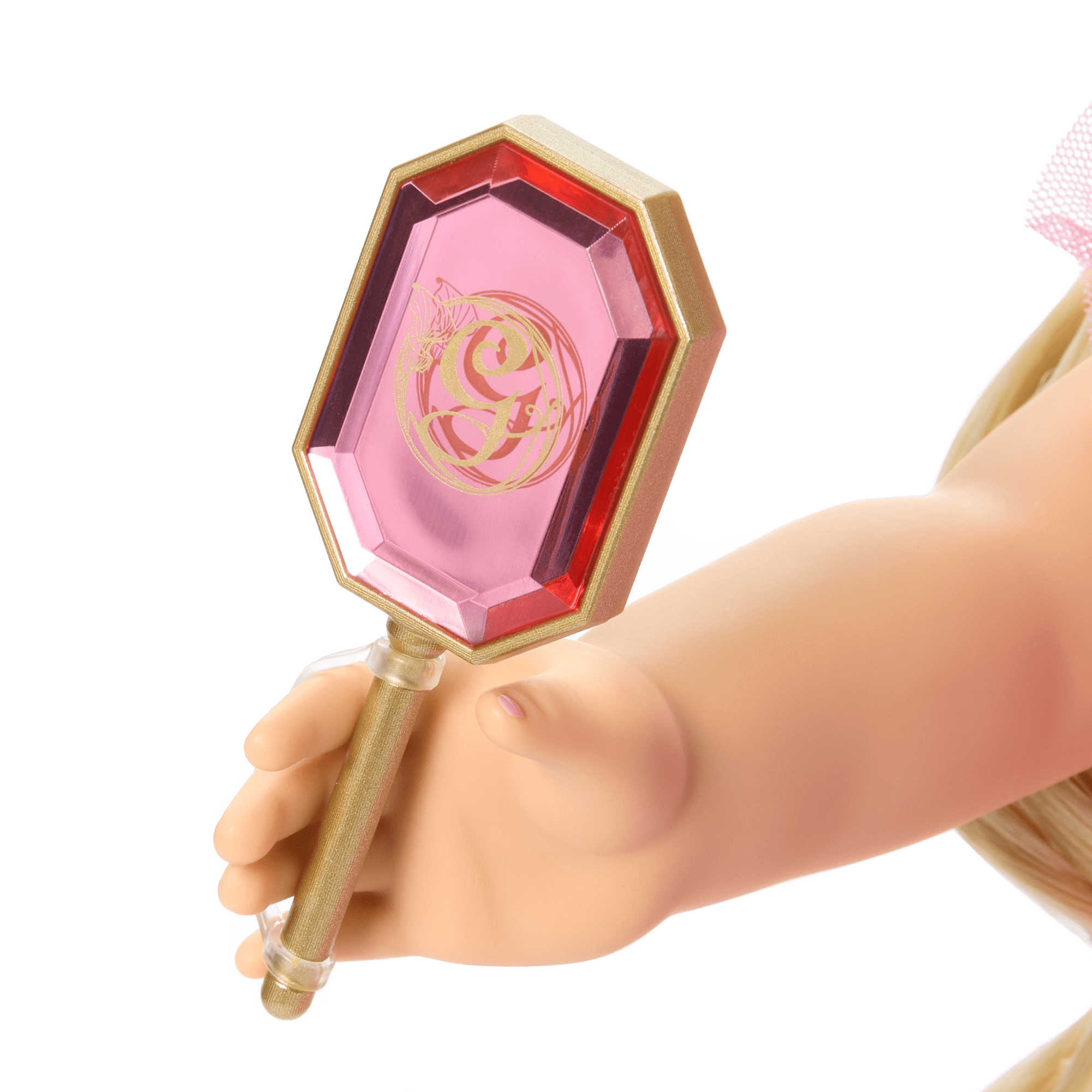 A gold-colored handheld mirror with a pink faux-gemstone detail and a Glinda icon graphic on the back